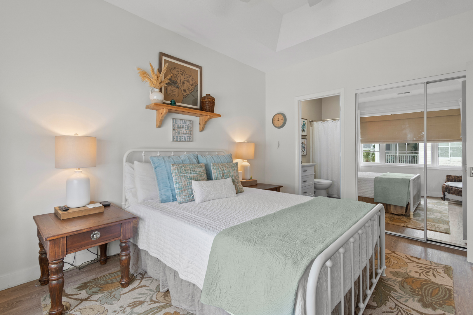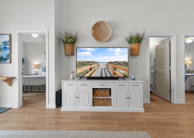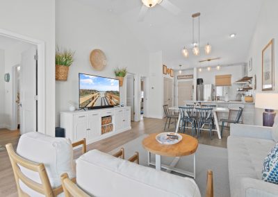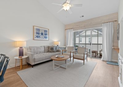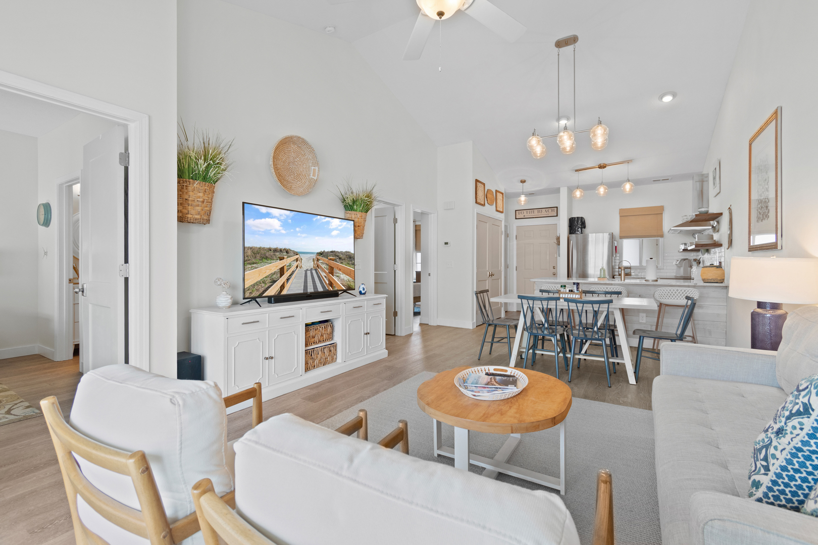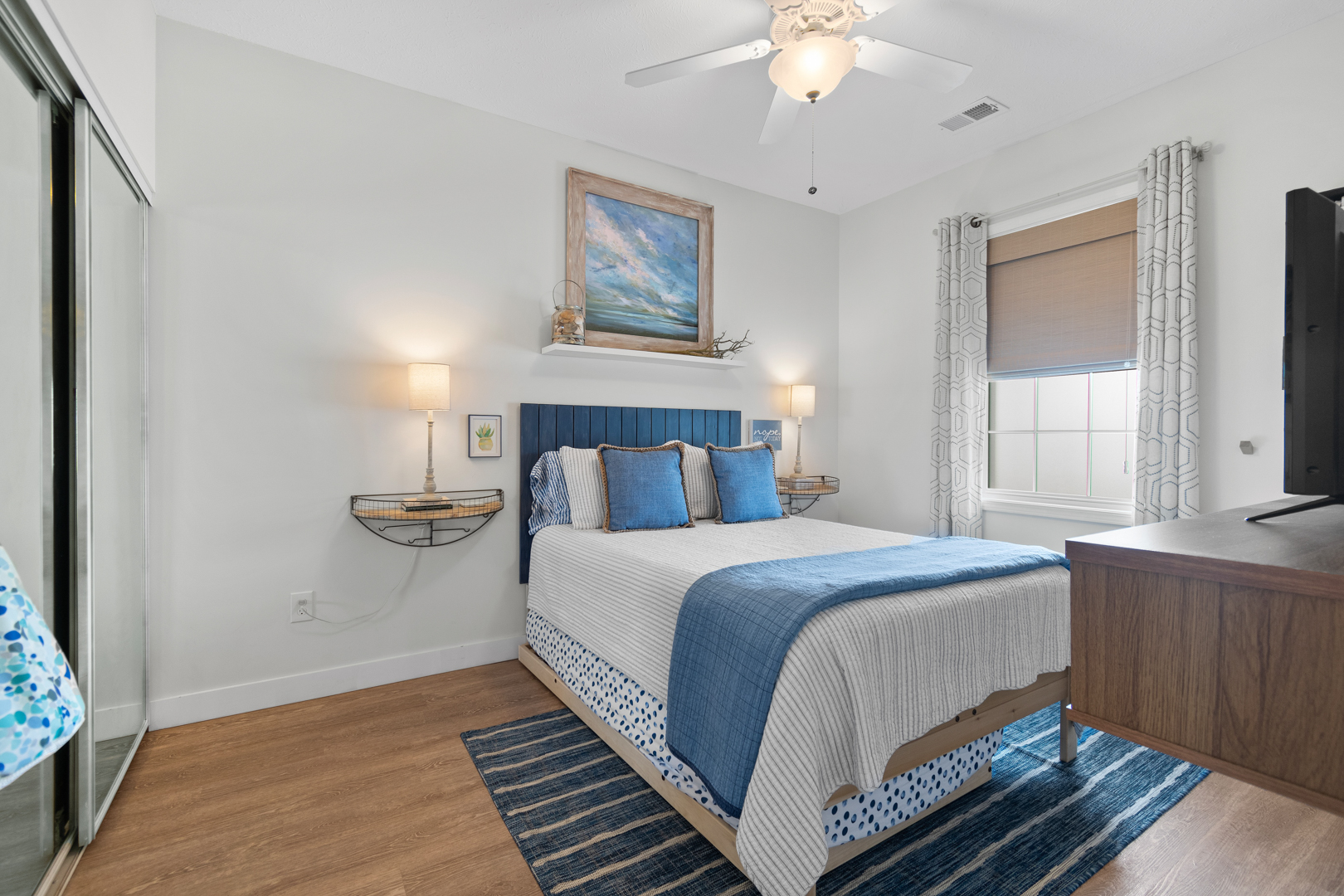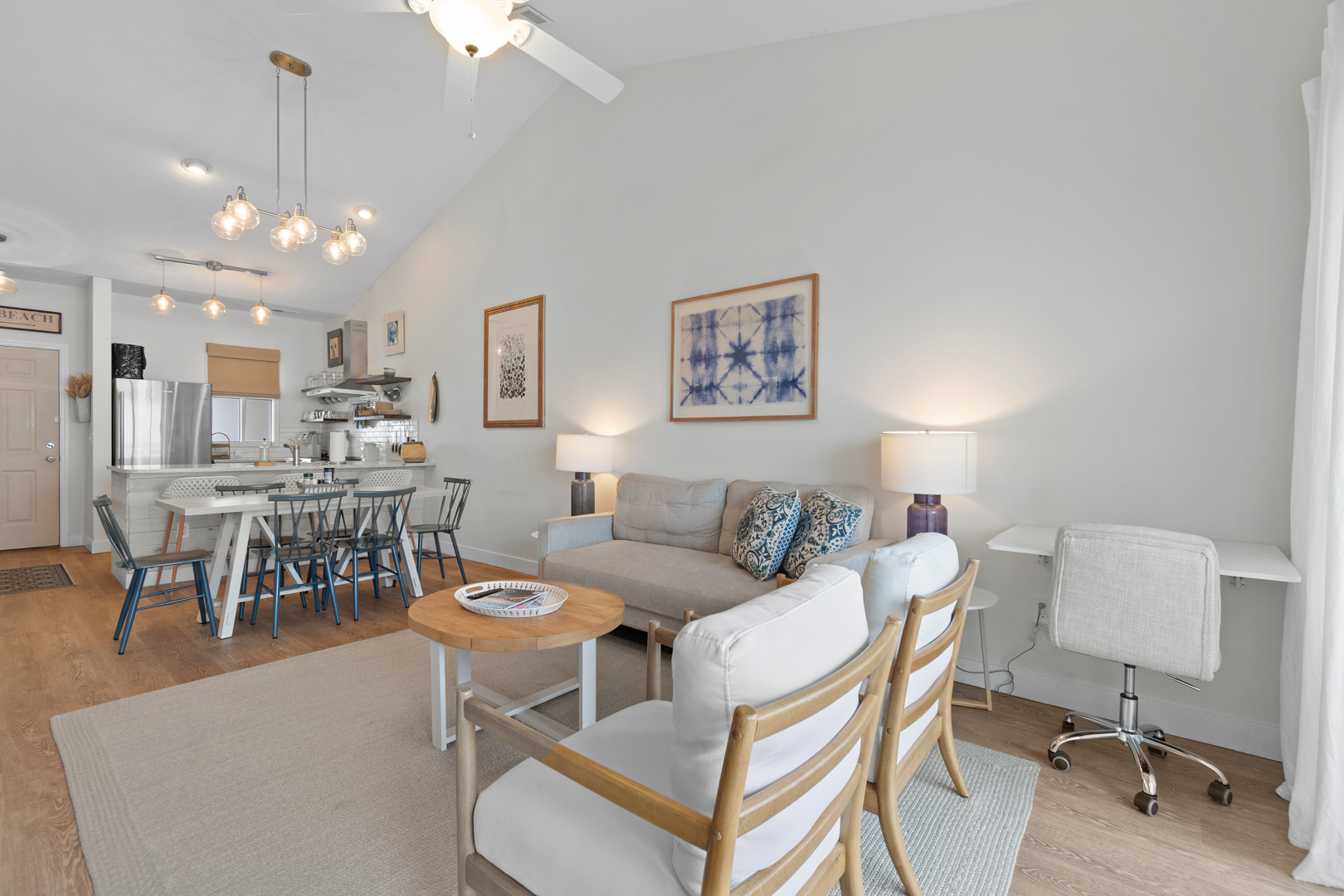 Plenty of natural light floods into this unit, contributing to its bright and cheerful feel. With LVP flooring throughout, fresh paint, and thoughtful updates, you will not need to do a thing but plan your trip. The water heater and HVAC were new in 2025 and the washer and dryer are full-size as opposed to stackable. The kitchen looks as if it could have been featured in a magazine, with quartz countertops, a large SS farmhouse sink, subway tile backsplash, stainless steel appliances including a vent hood, updated cabinetry and shelving and updated lighting fixtures. There is even a pantry for your small appliances and food items.