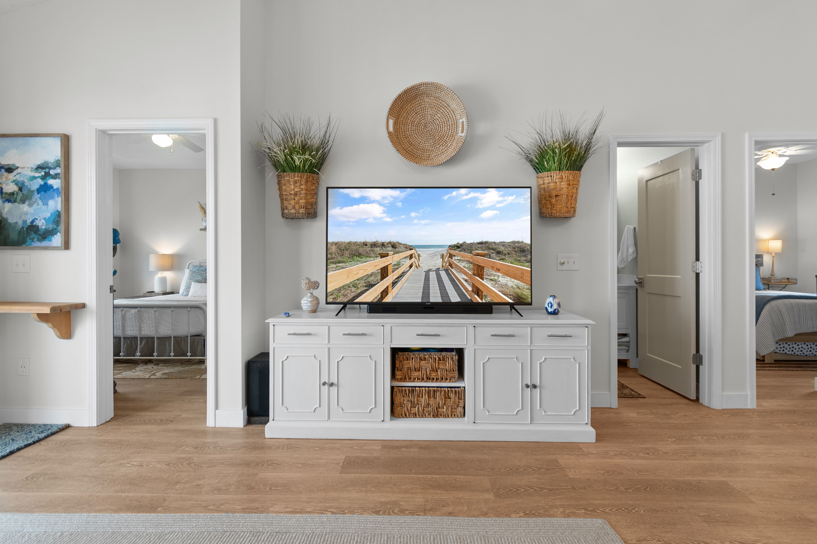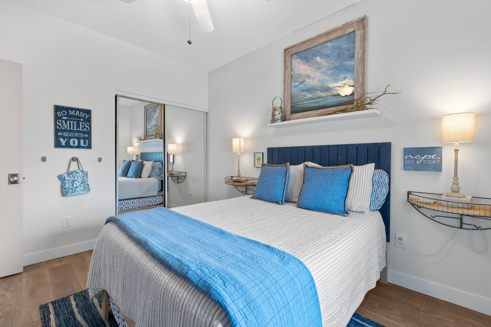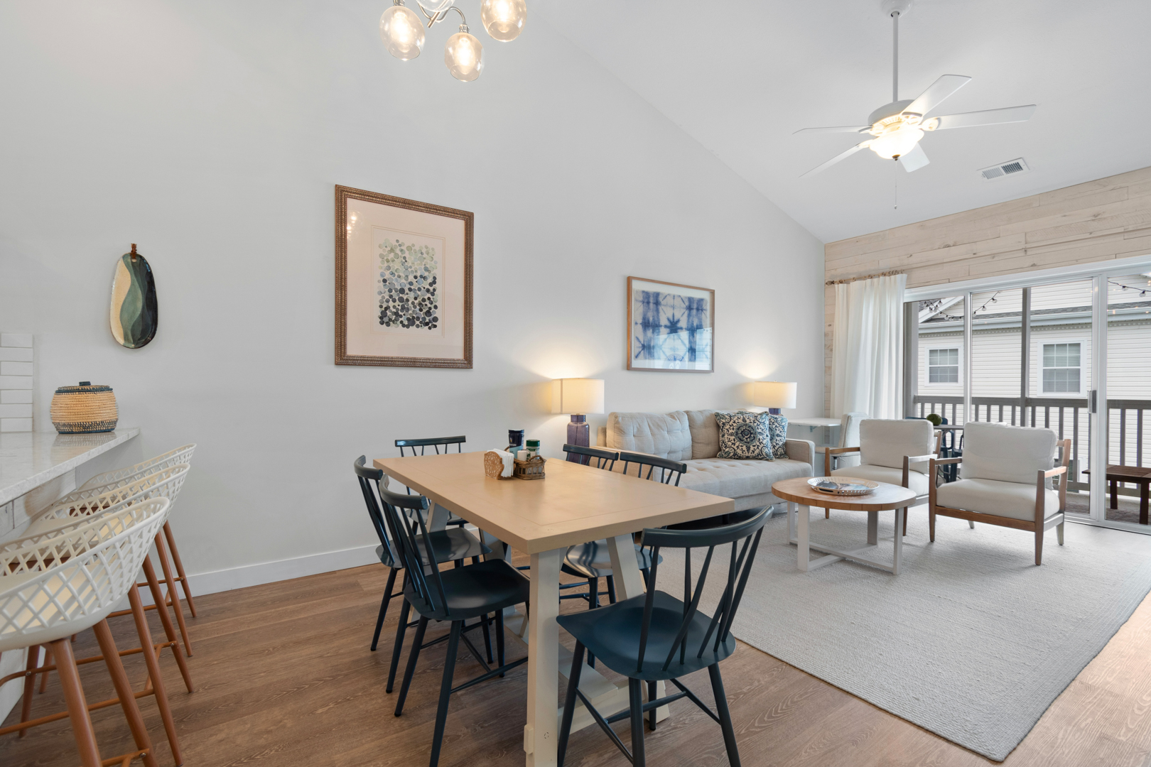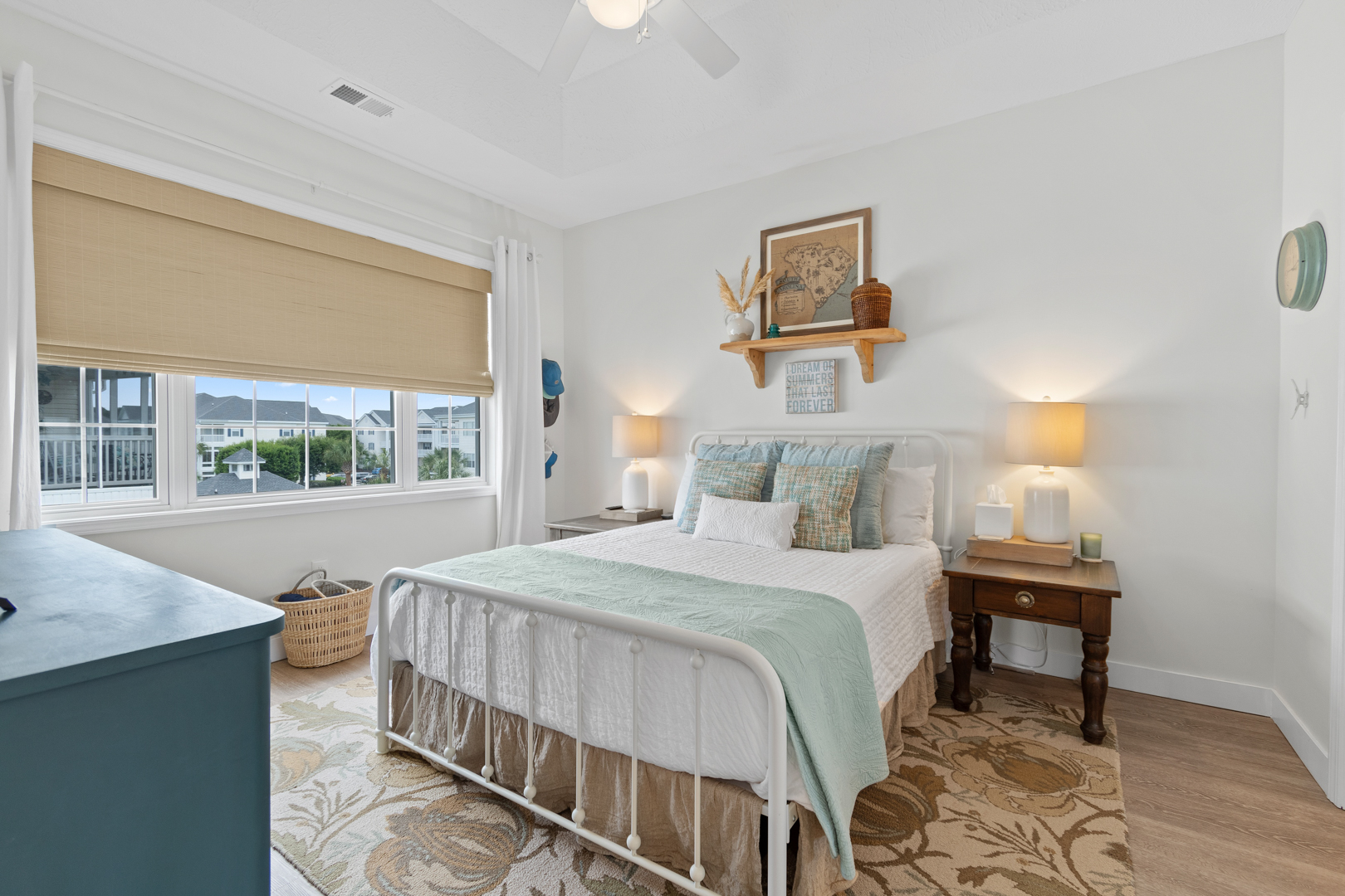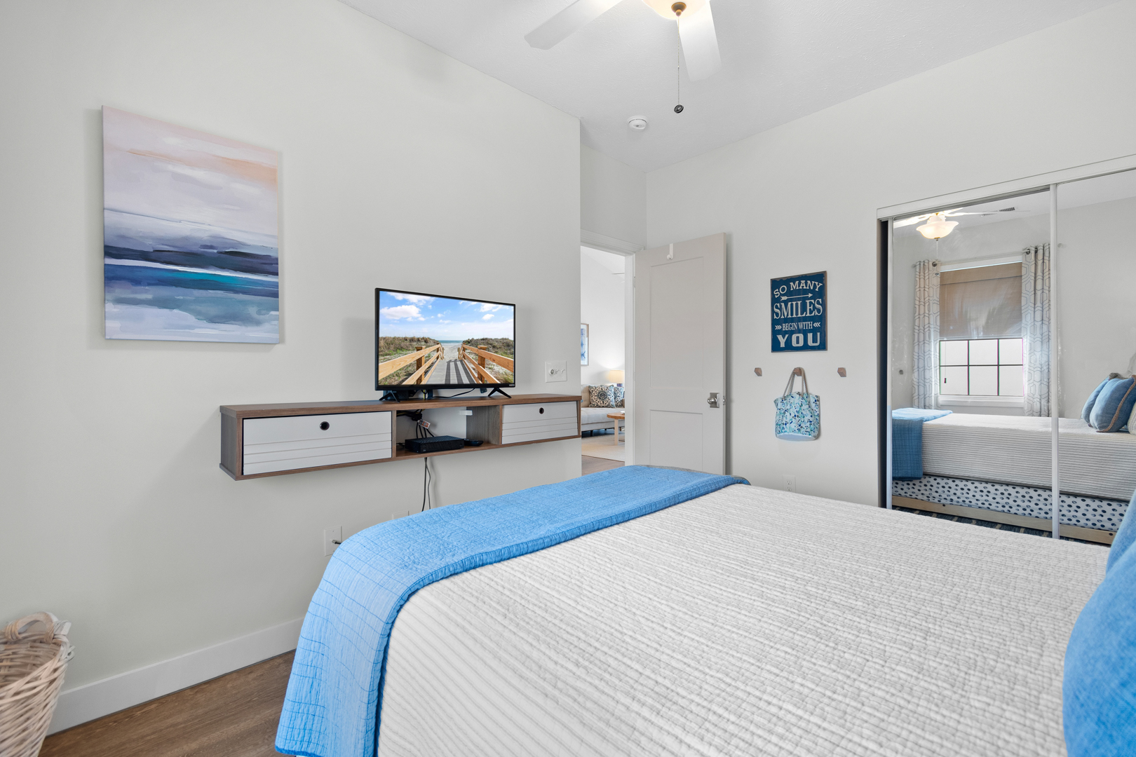 Plenty of natural light floods into this unit, contributing to its bright and cheerful feel. With LVP flooring throughout, fresh paint, and thoughtful updates, you will not need to do a thing but plan your trip. The water heater and HVAC were new in 2025 and the washer and dryer are full-size as opposed to stackable. The kitchen looks as if it could have been featured in a magazine, with quartz countertops, a large SS farmhouse sink, subway tile backsplash, stainless steel appliances including a vent hood, updated cabinetry and shelving and updated lighting fixtures. There is even a pantry for your small appliances and food items.